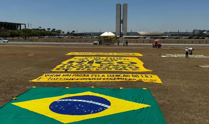 Na frente do Congresso Nacional, um grupo pede a aprovação do projeto o mais breve possível. Foram estendidas faixas e a bandeira do Brasil no gramado, questionando por que os ricos não pagam IR.