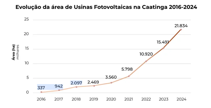 Gráfico do MapBiomas mostra o crescimento do setor de energia solar em áreas de Caatinga em quase uma década (Fonte: MapBiomas)