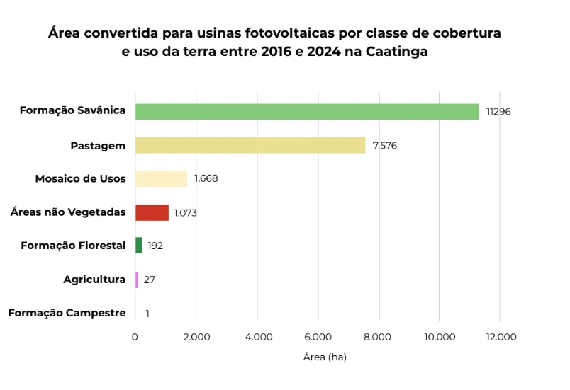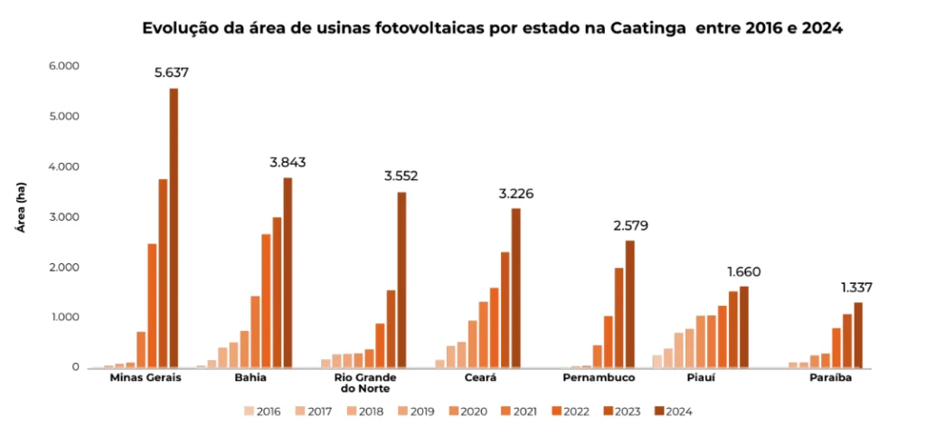 De acordo com dados do MapBiomas, 62% das usinas fotovoltaicas (energia solar) do Brasil estão instaladas na Caatinga. Mais de 21 mil hectares do bioma estavam ocupados, em 2024, por esse tipo de empreendimento. O estado da Caatinga com mais usinas solares no país é Minas Gerais, seguido por Bahia e Rio Grande do Norte. As áreas de formação savânica são as mais convertidas para a instalação das grandes usinas.