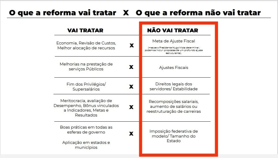 Grave é que o 28-A também viola o plano do próprio GT: na página 10, o documento chamado de “Premissas reforma administrativo_v13 -1” diz que “Ajuste Fiscal/Meta de Ajuste Fiscal não serão tratados”, exceto “se o Presidente Hugo Motta determinar”. Onde está esse ato? Sem a determinação formal que adite o escopo, o GT rompe as regras do jogo que ele próprio anunciou e injeta por frestas um ajuste fiscal estrutural sob o rótulo de “reforma administrativa”. E quando a torneira aperta por norma centralizada e sem lastro procedimental, começa-se a mexer nos alicerces do serviço público.