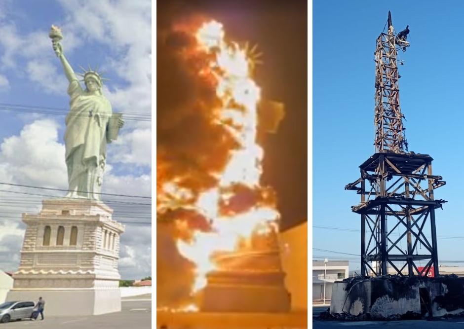 Na madrugada desta terça-feira (23), uma réplica da estátua da liberdade, marca registrada da rede de lojas Havan, em Petrolina, no Sertão pernambucano, pegou fogo. Em nota enviada à imprensa, a empresa afirma que a peça de 35 metros foi “completamente destruída” e que a ação foi criminosa. Imagens de uma câmera de segurança da loja mostram dois indivíduos se afastando do monumento por volta das 2h40. Na sequência, o fogo começa a se alastrar. O Corpo de Bombeiros foi acionado, mas só a estrutura metálica sobreviveu ao incêndio. Não há feridos. A Polícia Civil também foi acionada.