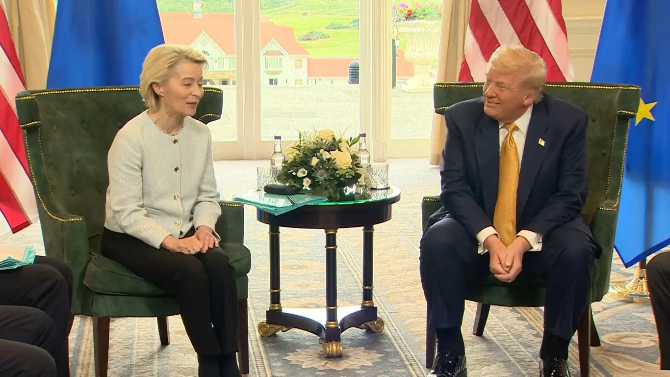 Neste domingo (17), o presidente dos Estado Unidos, Donald Trump, se reuniu com a presidenta da Comissão Europeia, Ursula Von Der Leyen, na Escócia, para negociar um acordo tarifário entre as duas partes.