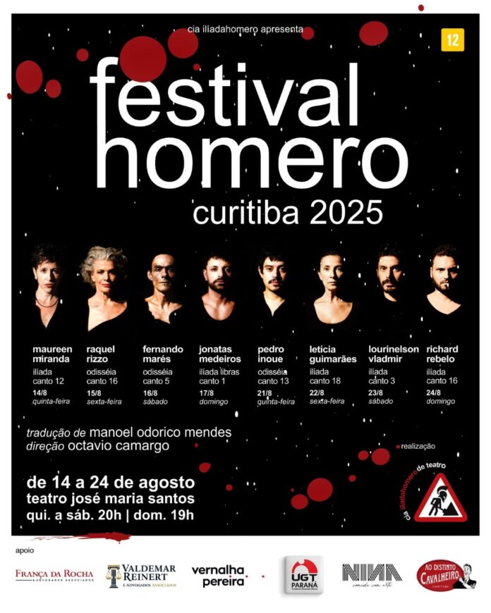 O Teatro José Maria Santos recebe, de 14 a 24 de agosto, o Festival Homero Curitiba 2025, que trará ao público oito espetáculos da Cia Iliadahomero de Teatro, única companhia brasileira dedicada à encenação integral da obra de Homero.