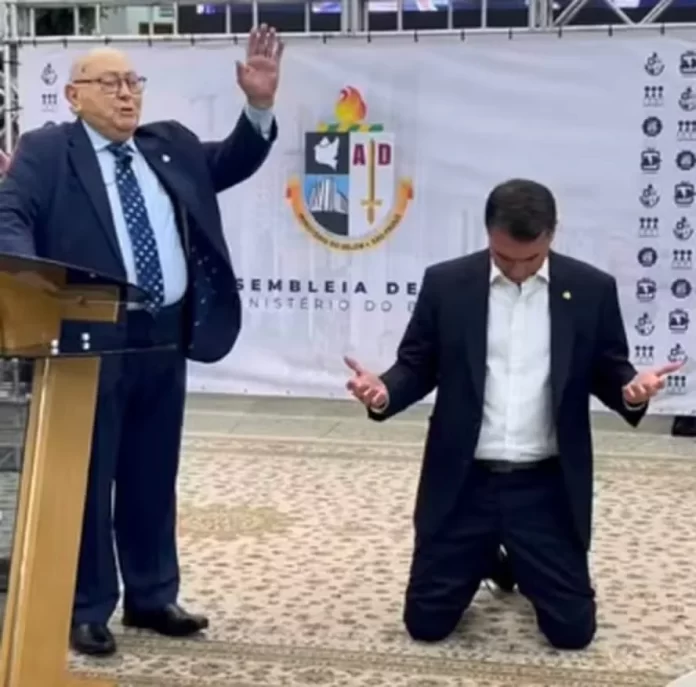 Flávio Bolsonaro esteve na Assembleia de Deus e publicou, em suas redes sociais, um vídeo em que aparece se ajoelhando e recebendo uma oração do bispo José Wellington Bezerra da Costa diante de ao menos 40 pastores.