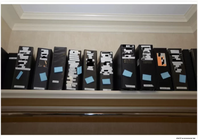 Numa das fotos, arquivos de propriedade do americano aparecem sobre uma estante em sua residência em Little St James, a ilha onde ele organizava operações criminosas com meninas menores de idades.