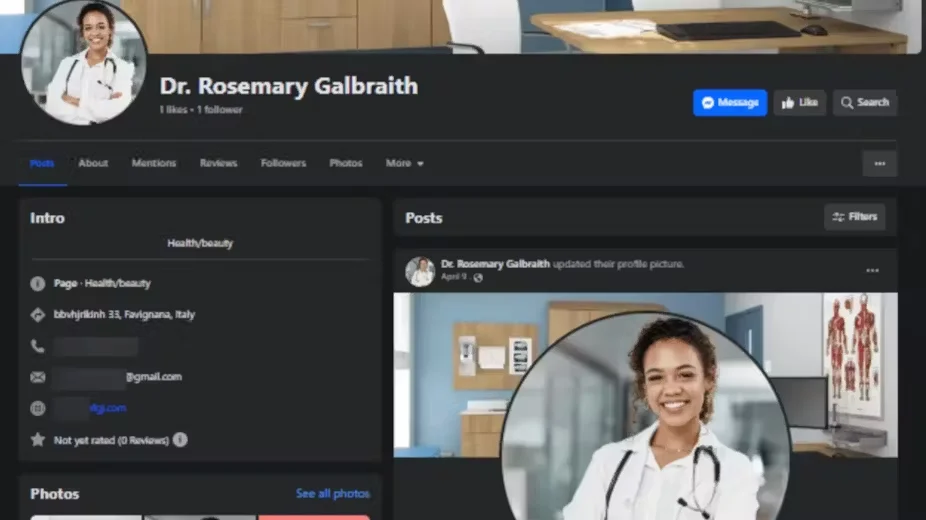 Você abre as redes sociais e se depara com uma publicação da Dra. Rosemary Galbraith, referência em saúde em Favignana, na Itália. No perfil de Rosemary, uma foto de jaleco branco, estetoscópio no pescoço e conteúdos com voz pausada de autoridade. Ela fala sobre curas milagrosas, suplementos secretos e terapias revolucionárias. O problema? A Rosemary não existe. E na verdade é apenas uma dentre as mais de 1.000 contas falsas identificadas na META, criadas por inteligência artificial, para promover curas milagrosas.