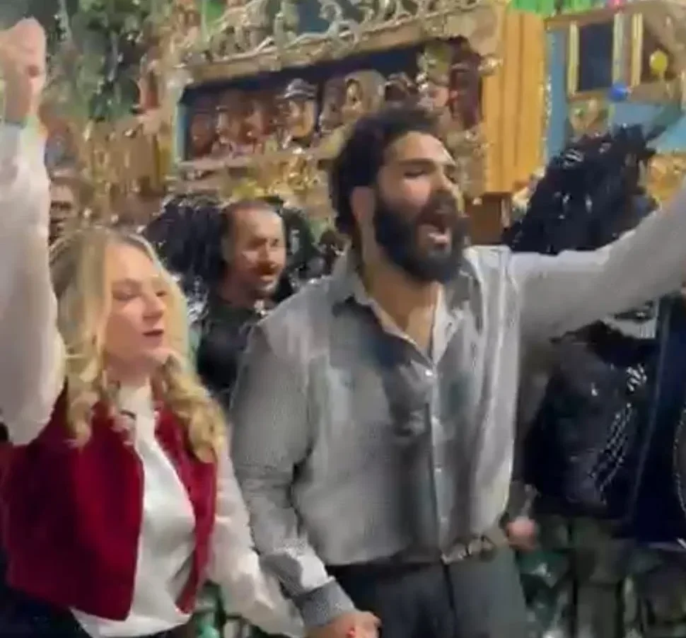 Na concentração da Acadêmicos de Niterói, que abre o primeiro dia de desfile na Sapucaí, na noite deste domingo (15), a atriz, cineasta e apresentadora do programa Precisamos Conversar, do canal ICL Notícias no YouTube, Juliana Baroni, se encontrou com o ator e comediante Paulo Vieira. Ela representa a ex-primeira-dama Marisa Letícia e Vieira interpreta o presidente Lula na juventude.