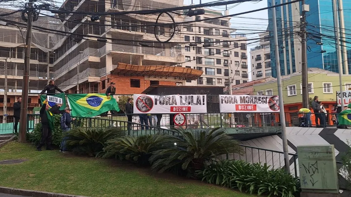 Com faixas estampando “Fora Lula!”, “Fora Moraes!” e o já velho bordão “Anistia Já”, os manifestantes de extrema direita fixaram os cartazes na estrutura do viaduto da Rua Comendador Fontana. Diante da escassez de gente para segurar os cartazes, recorreram ao apelo por buzinas, colando adesivos com a palavra “BUZINE” em letras vermelhas. O problema é que a algazarra sonora, longe de gerar solidariedade, despertou a irritação de moradores da região.