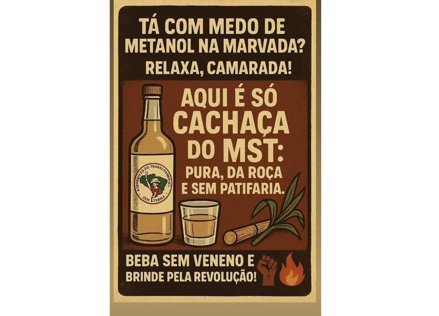 “Tá com medo de metanol na marvada? Relaxa, camarada! Aqui é só cachaça do MST: pura, da roça e sem patifaria. Beba sem veneno e brinde pela revolução”, diz o anúncio da feira, também publicado nas redes sociais.