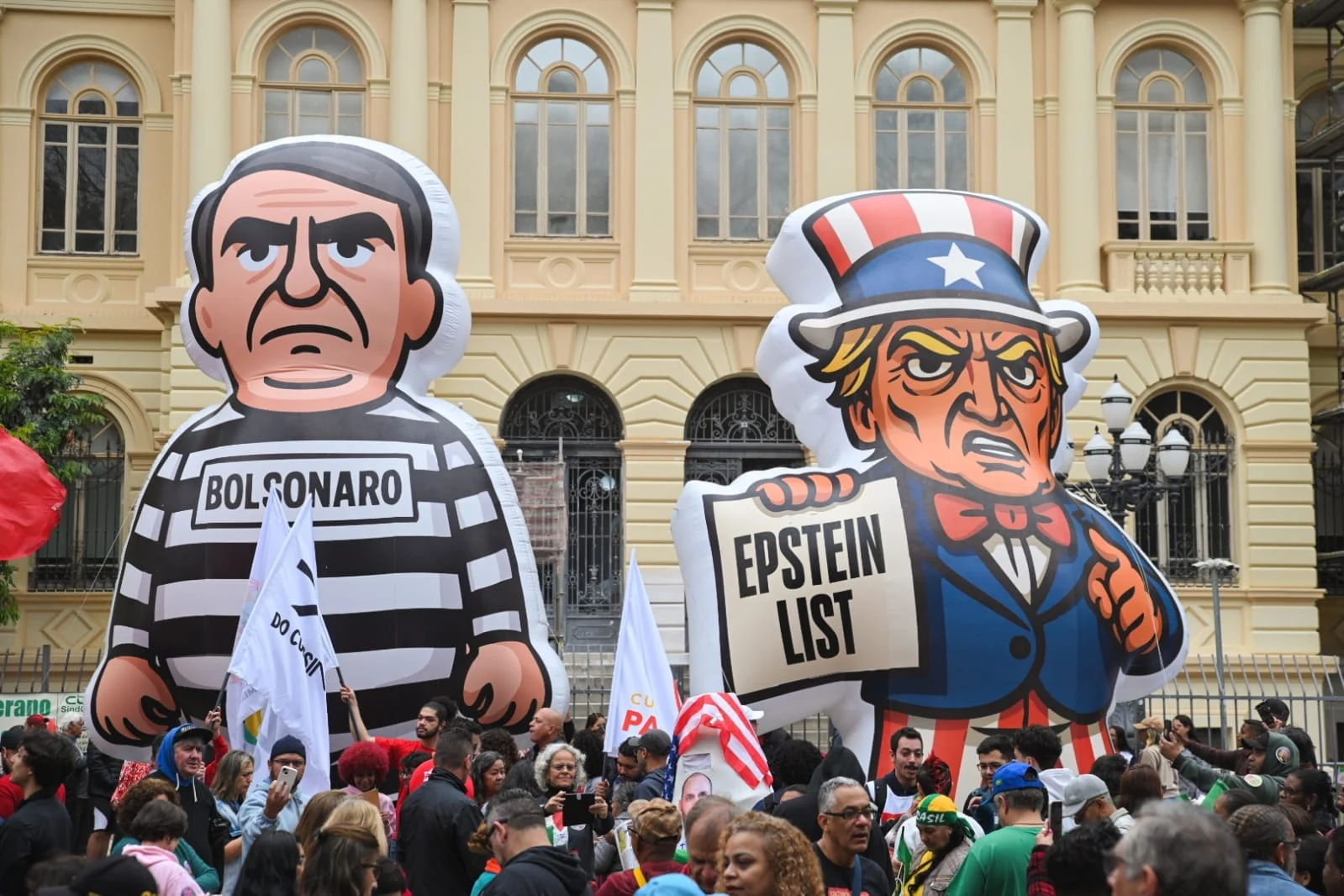 Manifestantes exibem cartazes de “Brasil soberano” e “o Brasil é dos brasileiros” em mensagem contra o tarifaço de Trump. Foram confirmadas, no ato da República, as presenças de Luiz Marinho, ministro do Trabalho e Emprego, e do presidente nacional do PT, Edinho Silva, além de deputados federais da base de Lula, como Guilherme Boulos (PSOL-SP) e Erika Hilton (PSOL-SP).