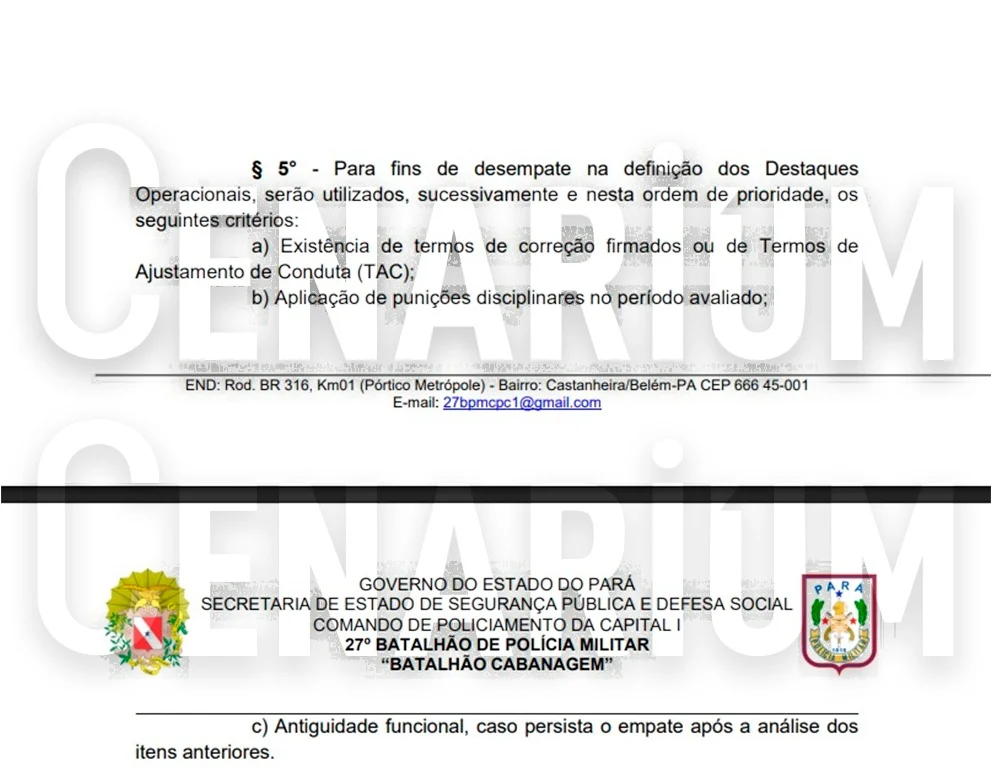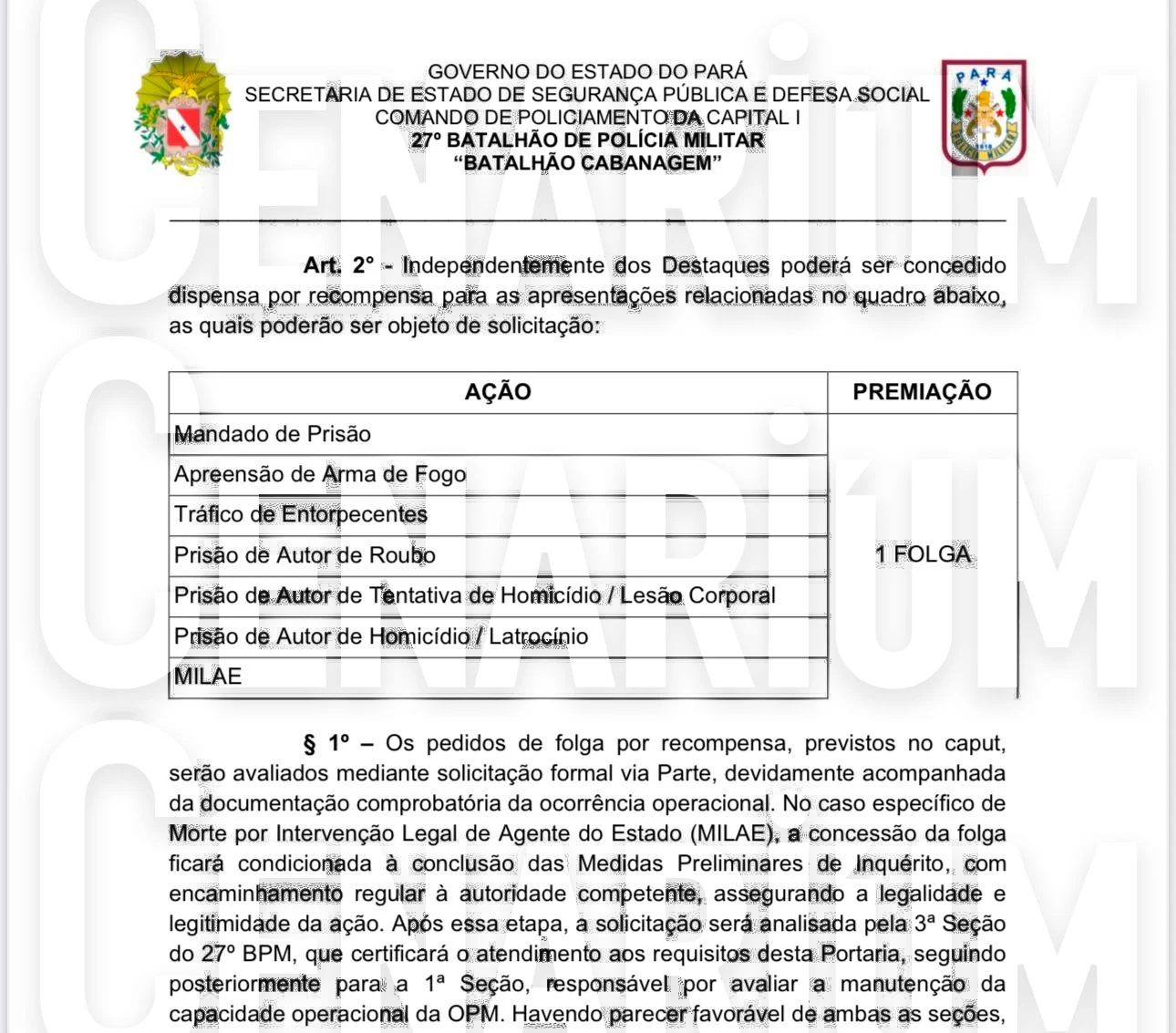 Uma minuta de portaria em nome do comandante do 27º Batalhão da Polícia Militar do Pará (PM-PA), major Bruno Gama Pereira, estabelece um ranking de produtividade, de 2 a 100 pontos, que recompensa com folgas os militares por diferentes tipos de ocorrências, entre elas, mortes por intervenção policial durante operações. A CENARIUM teve acesso, com exclusividade, ao documento datado de 16 de julho de 2025. A medida, que ainda não entrou em vigor, fez a Comissão de Direitos Humanos da Ordem dos Advogados do Brasil — Seção Pará (OAB-PA) classificar a iniciativa como preocupante por abrir espaço para práticas violentas e discriminatórias.