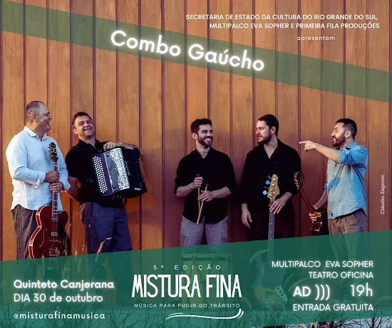 Com a proposta de fazer uma pausa sonora e dar aquela escapadinha do trânsito de Porto Alegre (RS) ao fim do dia, o projeto Mistura Fina recebe nesta quinta-feira (9) o espetáculo Combo Gaúcho. O show será apresentado pelo Quinteto Canjerana, às 19h, no Teatro Oficina Olga Reverbel – Multipalco Eva Sopher. O espaço faz parte do complexo do Theatro São Pedro, no centro da Capital. A entrada é franca.