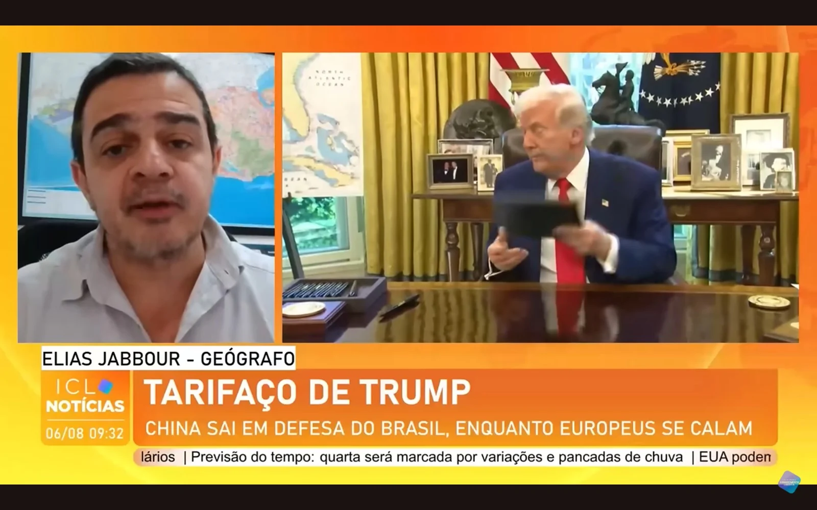 O geógrafo também comentou a defesa da China, maior parceiro comercial do Brasil. O país asiático foi o único até o momento a se manifestar contra o achaque de Trump contra o Brasil, apesar da relevância do tarifaço. A alíquota de 50% sobre produtos brasileiros é a maior até agora aplicada por Trump.