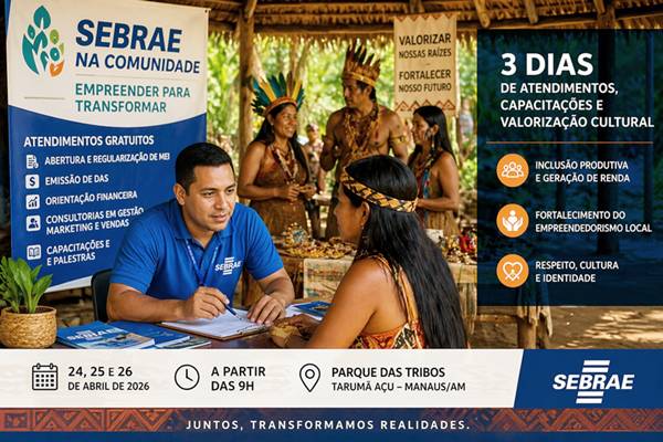 O Sebrae Amazonas promove, nos dias 24, 25 e 26 de abril, a partir das 9h, atendimentos gratuitos no Parque das Tribos, localizado no bairro Tarumã Açu, na Maloca dos Povos Indígenas. A ação integra o projeto “Sebrae na Comunidade – Empreender para Transformar” e tem como objetivo fortalecer o empreendedorismo local, com foco na inclusão produtiva e geração de renda.