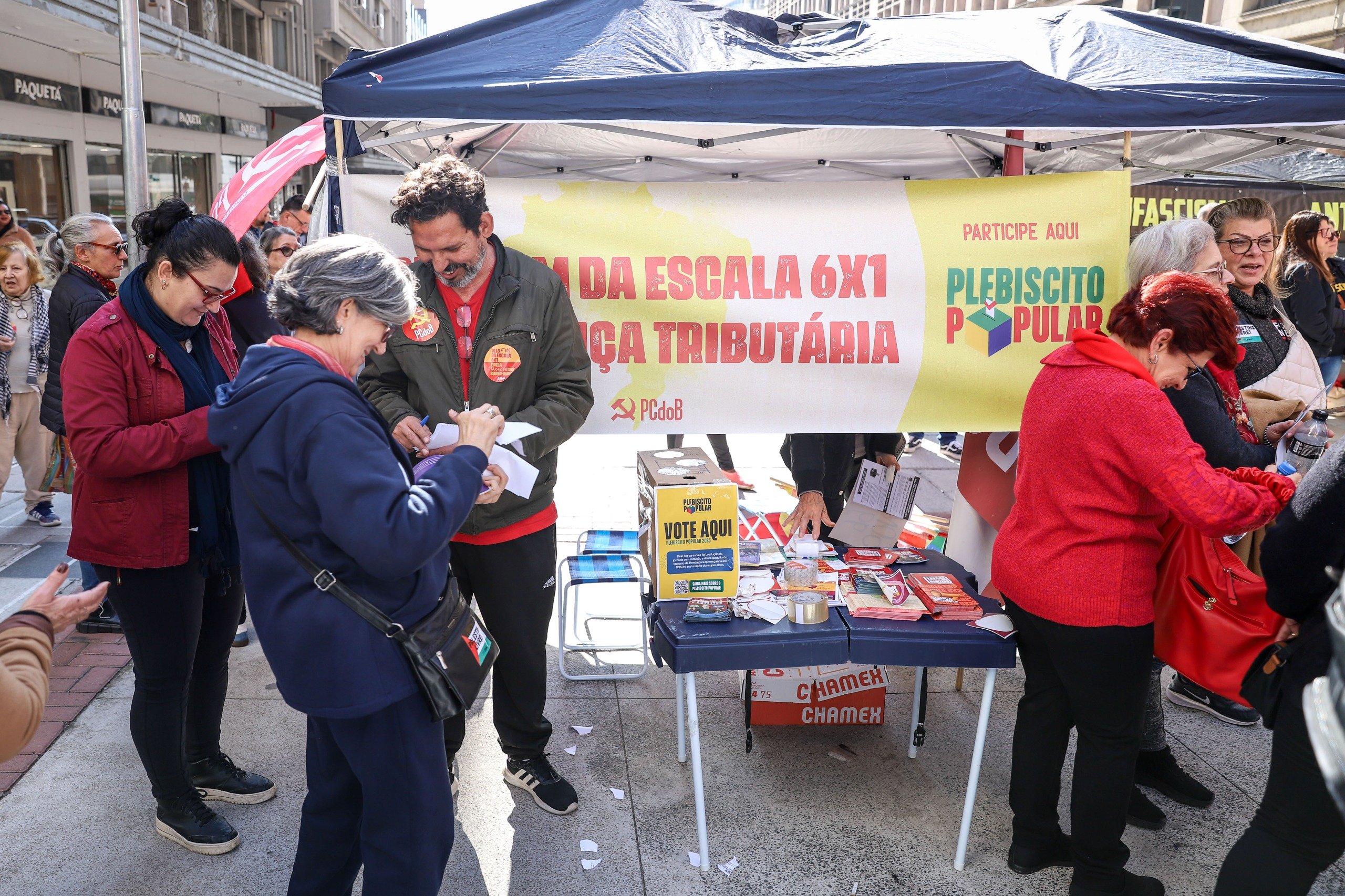 As propostas em votação no plebiscito incluem o fim da escala 6×1, a redução da jornada sem redução salarial, a isenção do Imposto de Renda para rendas de até R$ 5 mil e a taxação dos super-ricos. O debate sobre soberania nacional e a defesa de serviços públicos também faz parte da agenda.