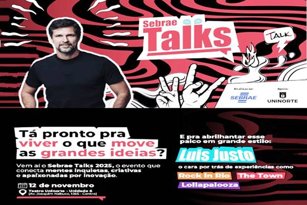 O Sebrae Talks chega à sua segunda edição no dia 12 de novembro, às 18h, no Teatro da Uninorte – Unidade 6 (Av. Joaquim Nabuco – Centro de Manaus). Com o objetivo de oferecer soluções práticas e inspiradoras para empreendedores locais, o evento contará com a presença de Luis Justo, CEO da Rock World, empresa responsável por festivais como Rock in Rio, Lollapalooza Brasil e The Town. As inscrições podem ser feitas pelo link: https://www.sympla.com.br/evento/sebrae-talks-2025-palestra-os-bastidores-do-rock/3196106 .