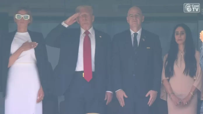 Na imagem do telão, Trump aparecia de pé, ao lado do presidente da FIFA, Gianni Infantino. Algumas vaias ecoaram, e a tela rapidamente mudou para outro lugar. Trump assiste à partida entre Paris Saint-Germain, da França, e Chelsea, da Inglaterra, com a mulher, a primeira-dama Melania Trump.