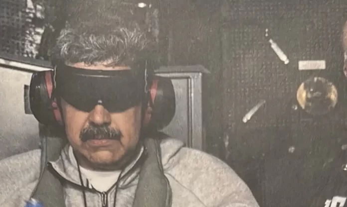 Na imagem, Maduro aparece vendado e usando um conjunto de moletom cinza. Ele segura uma garrafa de água. Trump informou hoje que Maduro e a primeira-dama Cilia Flores estão sendo levados de navio para Nova York.